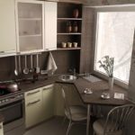- Подоконник, плавно переходящий в обеденный стол – прерогатива маленьких кухонь, но в помещении 14 м² такое расположение может иметь место.
