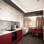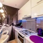 - Обозначить четкую границу прямоугольной кухни помогает барная стойка. Она может быть стационарной и мобильной, легкой, еле заметной и основательной, выполненной из массива дерева. В любом случае описываемый предмет всегда будет многофункциональным. Он обязательно будет использоваться ежедневно в качестве обеденного стола, быть главным атрибутом при организации фуршетов.