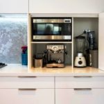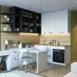 - Так как происходит объединение двух разных по назначению комнат, важно сразу устанавливать мощную вытяжку, которая позволит предотвращать распространение запахов во время приготовления пищи.