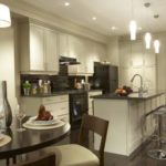 - Стол и стулья выбирайте после того, как полностью будет выполнена отделка и установлен на своё место угловой или п-образный гарнитур. Типовая «хрущёвка» не может похвастаться наличием просторных кухонь, поэтому часто стандартный обеденный стол заменяет компактная барная стойка. Комната получится уютной, если столешница стойки будет выполнена в цвет обоев. В тон к ним подбирается и кухонный фартук.