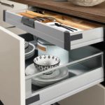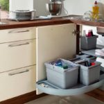 - Попробуйте уменьшить глубину нижних шкафов. Закажите кухонный гарнитур, у которого вместо стандартной глубины в 60 см, глубина ящичков составит 40 см.