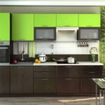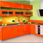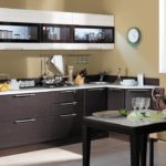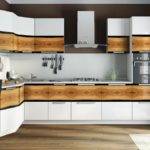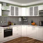 - Напольные и подвесные шкафы, полностью заполняя ими все вертикальное пространство стены выше зоны рабочего фартука. Так как в маленьком помещении необходимо использовать каждый сантиметр свободного пространства, на 6 кв.м. обязательно нужно вешать угловые шкафы с открытыми полками.