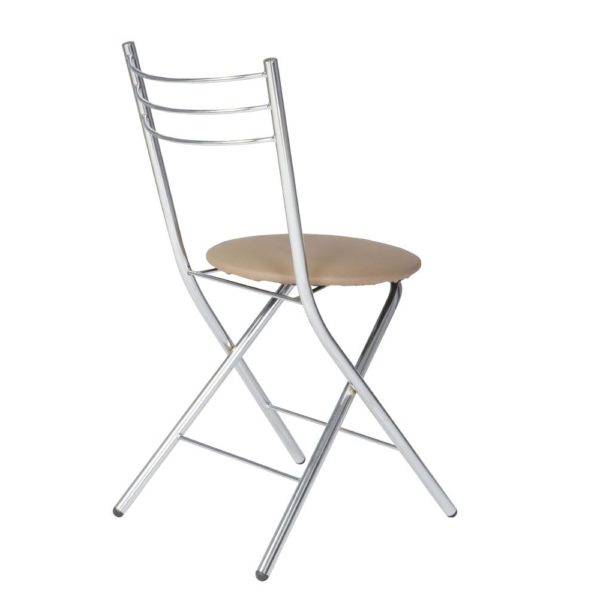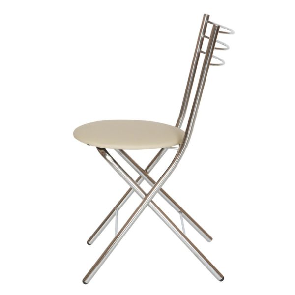 Стул Сигма отличается утонченным силуэтом и замысловатой конструкцией. Металлический каркас стула представляет собой набор хромированных трубок двух диаметров, изогнутых разными способами. Добавив круглое сиденье из кожзама, дизайнеры создали элегантный складной стул. Даже в разложенном виде он не занимает много места, если же его сложить, то он вполне поместится за дверью или в узком пространстве между шкафом и стеной. Сидеть на нем удобно — стяжки на каркасе могут служить еще и подставкой для ног.