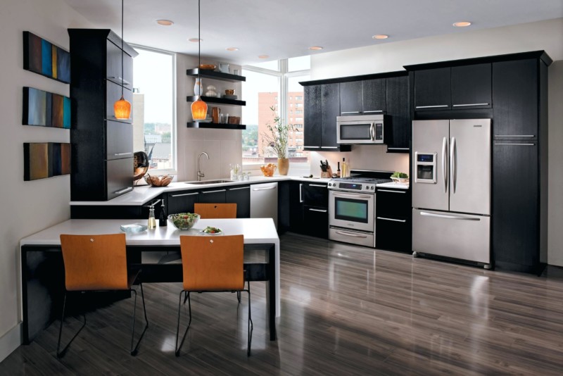 Здесь нет места громоздкой мебели, напыщенности, витиеватому текстилю. Простота, строгость, современность – три основных черты описываемой концепции. В модерне приветствуется использование навесных шкафчиков. Они могут появиться не только на втором ярусе кухонного гарнитура, но и (если позволяет площадь) над диванной группой. При оборудовании кухни применяется встраиваемая бытовая техника. И рабочая столешница, и обеденная группа должны быть всегда очищены от посторонних предметов. Скрыть от глаз нужно все коммуникации, электропровода и газопроводы.
