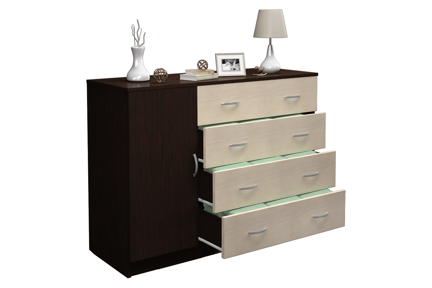 Комод выполнен из ЛДСП (плиты толщиной 22 мм и 16 мм) с ПВХ кантом (2 мм и 0, 4 мм) и МДФ (16 мм). Дно ящиков надежно фиксируется специальными уголками и выполнено из ДВП, обработанной с двух сторон, что предотвращает осыпание опилок на хранящееся белье. Фасады ящиков из МДФ украшены фрезеровкой и печатью с фантазийными рисунками.
