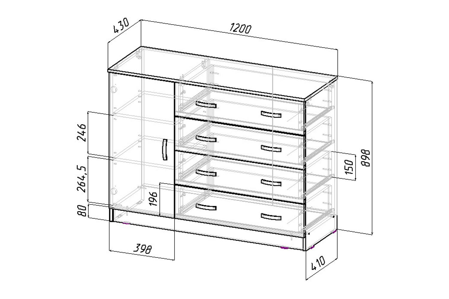 Ширина - 46 см; Глубина - 44, 8 см; Высота - 94, 2 см; Вес - 27 кг; Объем - 0, 08 куб. м; Цвет - вишня; Материал каркаса - ЛДСП; Материал фасада - ЛДСП, МДФ; Материал обивки - без обивки; Угол - прямой; Раскладывание - нет; Количество ящиков - 4; Зеркало - не предусмотрено; Гарантия - 24 мес; Производитель - Мебель России;