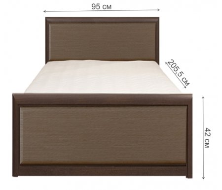 Категории: Кровати, Мебель для спальни, Односпальные кровати Бренд: Анрэкс Характеристики:Ширина кровати - 95 см; Длина кровати - 205, 5 см; Ширина спального места - 90 см; Длина спального места - 200 см; Высота спинки (изголовье) - 42 см; Высота изножья - 75, 5 см; Материал кровати - ЛДСП, МДФ; Материал обивки - без обивки; Цвет поставщика - штрокс; Подъемный механизм - отсутствует; Матрас - в комплекте; Бельевой ящик - не предусмотрен; Основание под матрас - в комплекте; Материал основания под матрас - с деревянными ламелями; Страна производителя - Беларусь; Гарантия - 24 мес; Вес - 72, 58 кг; Объем - 0, 497 куб. м;Ещё предложения